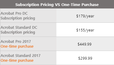 Acrobat Pro DC Subscription pricing: $179/year Acrobat Standard DC Subscription pricing: $155/year Acrobat Pro 2017 One-time purchase: $449.99 Acrobat Standard 2017 One-time purchase: $299.99